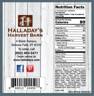 Organic Potato Starch, Freeze Dried Corn, Dehydrated Potato, Vegetarian Chicken Stock (Salt, Dextrose, Yeast Extract, Autolyzed Yeast, Onion, Garlic, Expeller Pressed Canola Oil, Extractive of Turmeric, Paprika, Celery Seed), Potato Flakes, Natural Smoke Flavor, Onion Flake, Butter Powder (Whey Solids, Enzyme-Modified Butter, Maltodextrin, Salt, Dehydrated Butter, Guar Gum, Annatto, Turmeric), Celery Flake, Parsley, Granulated Garlic, Black Pepper, Chive