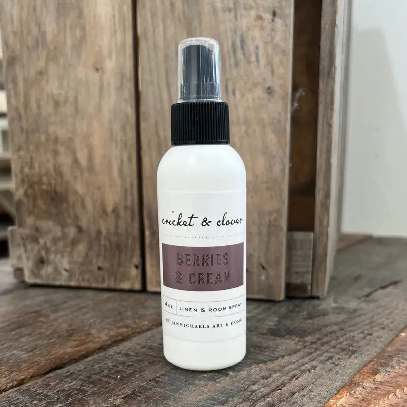 Scent Note Profile: Top Note: Red Raspberry Puree, Red Currant Middle: Strawberry, Vanilla, Blackberry Base: Vanilla Cake, Cream, Sugar Linen and Room Spray: Each Cricket and Clover Room and Linen Spray is handmade in small batches in Lancaster, PA. Freshen up any room or linen with our handmade scents. This is just one more way of enjoying our preferred candle aromas, but in a flameless way. A burst of freshness is guaranteed with each spray from the 4oz bottle.