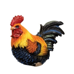 The Colorful Resin Rooster Figurine is a versatile, detailed figurine perfect for everyday country farmhouse decor. Made from resin, the figurine depicts a rooster with a carved feather texture. Bold orange and yellow hues make up his top feathers, while tail and belly feathers feature rich blue and black shades. The rooster has a red comb and wattle, detailed feet, and an orange beak. A flat bottom allows the figurine to sit freely on a shelf or tabletop. Measures 3” high by 2” wide by 3.5” deep.
