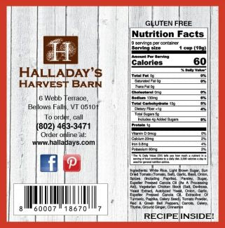 White Rice, Light Brown Sugar, Sun dried Tomato (Tomato, Salt), Garlic, Basil, Onion, Spices (Including Paprika), Parsley, Sugar, Expeller Pressed Canola Oil (as a processing aid), Vegetarian Chicken Stock (Salt, Dextrose, Yeast Extract, Autolyzed Yeast, Onion, Garlic, Expeller Pressed Canola Oil, Extractive of turmeric, Paprika, Celery seed), Tomato powder, Red & Green Bell Peppers, Carrots, Celery, Thyme, Ground Ginger, Cinnamon