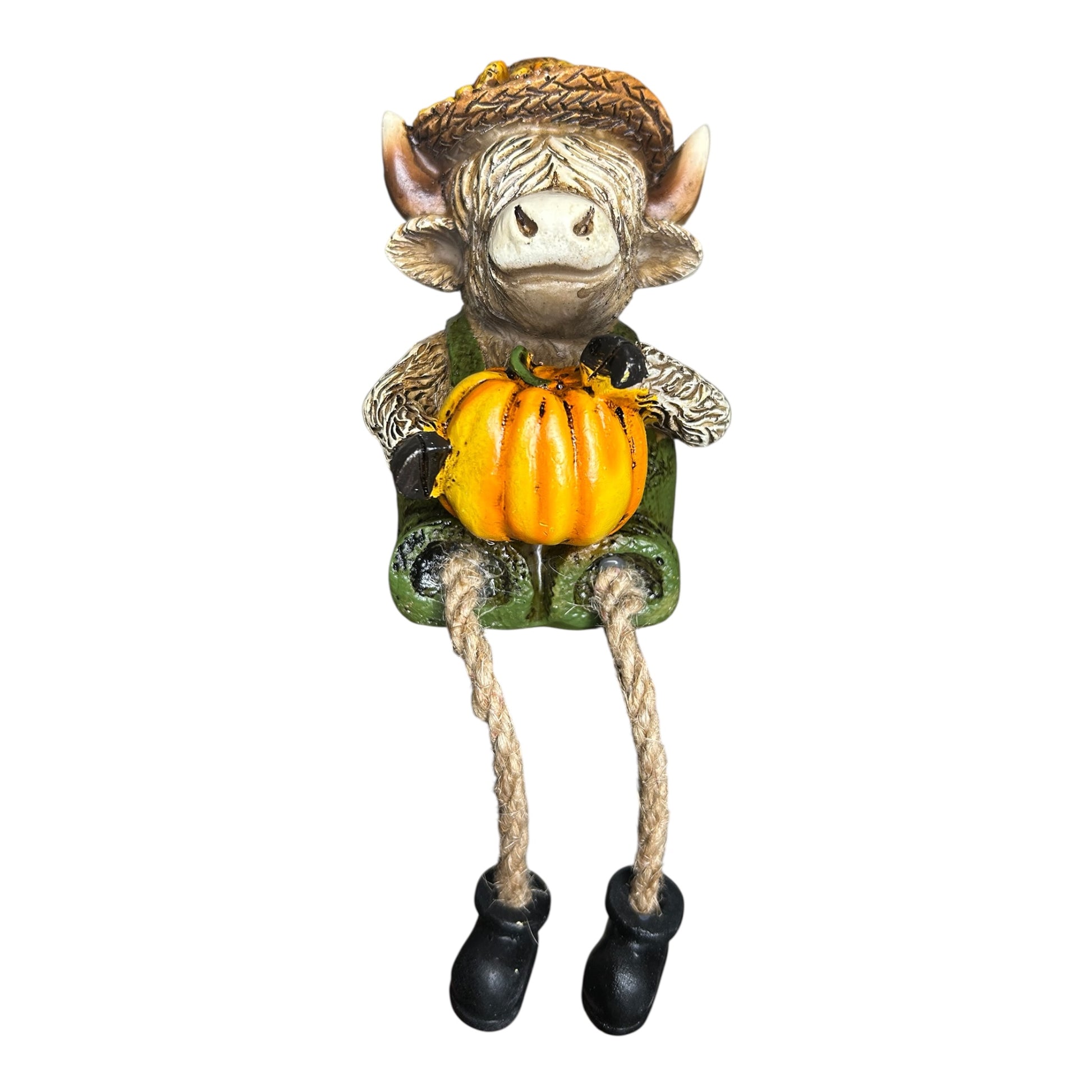 Bring the cozy charm of autumn into your home with this Fall Highland Cow Shelfsitter Figurine! Measuring 7" in size, this delightful piece features an adorable Highland cow adorned with a pumpkin, capturing the essence of the season. With its warm colors and whimsical design, this figurine adds a touch of rustic elegance to any shelf, mantle, or tabletop. Whether displayed alone or as part of a seasonal arrangement, it's sure to bring a smile to your face and evoke the beauty of fall in your home decor. Dimensions: 3" W. x 7" H.
