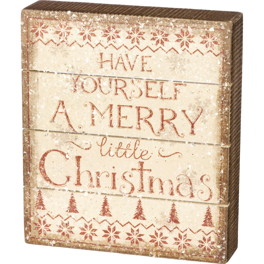 A rustic, Nordic-inspired wooden box sign lending distressed "Have Yourself A Merry Little Christmas" sentiment with tree and snowflake border designs. Coated in a layer of clear mica for a subtle sparkle. Easy to hang or can free-stand alone. Complements well with coordinating design pieces for a festive home decor collection.