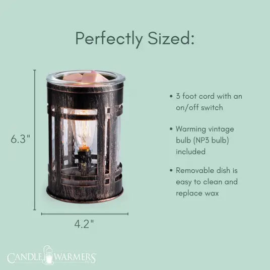 DESIGN: The warm glow of an exposed bulb shines through bubble glass in geometric shapes, framed by the burnished brown metal of the Mission Vintage Bulb Illumination. * USE: Add scented wax melts to the removable warming dish to safely release fragrance throughout your home. Recommended with our Artisan or Aromatherapy soy wax melts or Classic or Odor Eliminating soy blend wax melts. * FUNCTION: Decorative electric fragrance warmer designed to warm scented wax and create the ambient glow of a burning candle. Includes NP3 Vintage Bulb. * FUNCTION: No flame reduces the risk of house fires, while also eliminating carbon toxins, smoke and soot from the air.